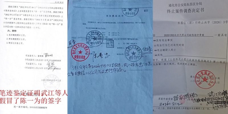 本站讯 2026年春节前夕,吉林省通化市北方汽贸集团(简称北方汽贸)董事长陈一为,伫立在濒临破产的公司门前,手中紧攥着一叠沉甸甸的证据材料司法鉴定书、嫌疑人确认书、法院判决书、公安机关立案文书这些足以证明武江、陈秀忠等人涉嫌巨额诈骗的铁证,却未能...
