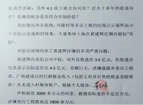 举报信详细列举了黄建辉涉嫌的多项严重问题:黄建辉内弟的公司中标,对外宣称造价3.6亿元,但街道办信息显示实际造价达4.5亿元,差额巨大,涉嫌虚报并贪污工程款。广场建成后的巨额租金收入(包括王府井百货的租金及赔偿款)从未进入村集体账户,疑被个人侵吞。声称耗资3000多万元的祠堂,被指实际造价不足百万元,涉嫌贪污工程款高达2800余万元。更令人震惊的是,霞山村副主任黄华生(黄建辉堂弟)及其胞弟黄建伟,长期以个人名义收取村属物业(如华联大厦附属商铺、群豪服装店)的租金,甚至私自挪用村庙收入高达110万元,村集体财务管理形同虚设,家族式腐败特征明显。