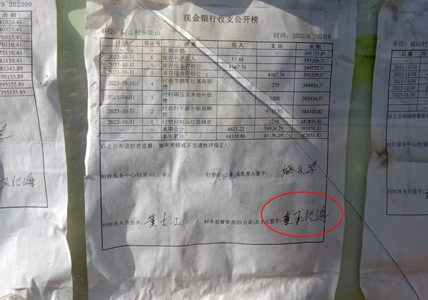 村民们还反映,2023年部分月份的现金银行收支公开榜也不真实,村书记姚某学和村财务人员董某江在上边签字不知真假,村务监督委员会主任石某海的签字肯定是他人代签,石某海明确表示不知情,非他本人所签。